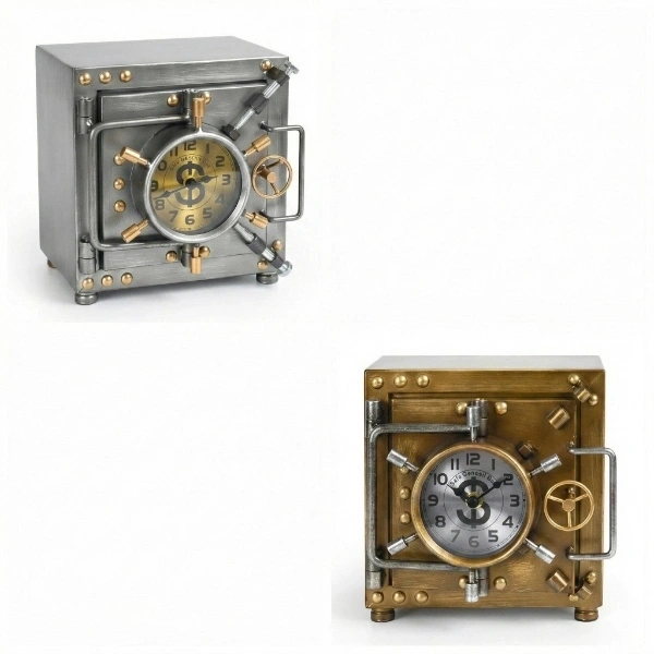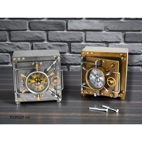 KASA TASARIMLI MASAÜSTÜ SAATÜrün ÖzellikleriKasa tasarımlı masaüstü saat, klasik kasa kapaklarından ilham alan detaylı ve özgün görünümüyle dekoratif saat kategorisinde öne çıkan özel bir modeldir. Metal görünümlü gövdesi, vidalı ve kilitli kasa detayları sayesinde endüstriyel ve retro dekorasyon tarzını başarıyla yansıtır. Saatin ön yüzünde yer alan yuvarlak kadran, net rakam yapısı ile kolay okunabilirlik sunarken mekanik kasa hissi veren tasarımı bulunduğu ortamda dikkat çekici bir dekor unsuru oluşturur. 17x20x21 cm ölçüleri sayesinde masa, raf, kitaplık, ofis masası veya vitrin üzerinde dengeli ve güçlü bir duruş sergiler. Sessiz akan mekanizması sayesinde çalışma, dinlenme ve ofis ortamlarında rahatsızlık oluşturmaz. Dayanıklı yapısı uzun süreli kullanım için uygundur. Renk seçeneği bulunmamaktadır; ürün gümüş veya altın tonlu kasa seçeneklerinden karışık olarak gönderilmektedir. Hem fonksiyonel hem de dekoratif bir masa saati arayanlar için şık ve farklı bir alternatiftir.Paket İçeriği1 adet kasa tasarımlı masaüstü saat