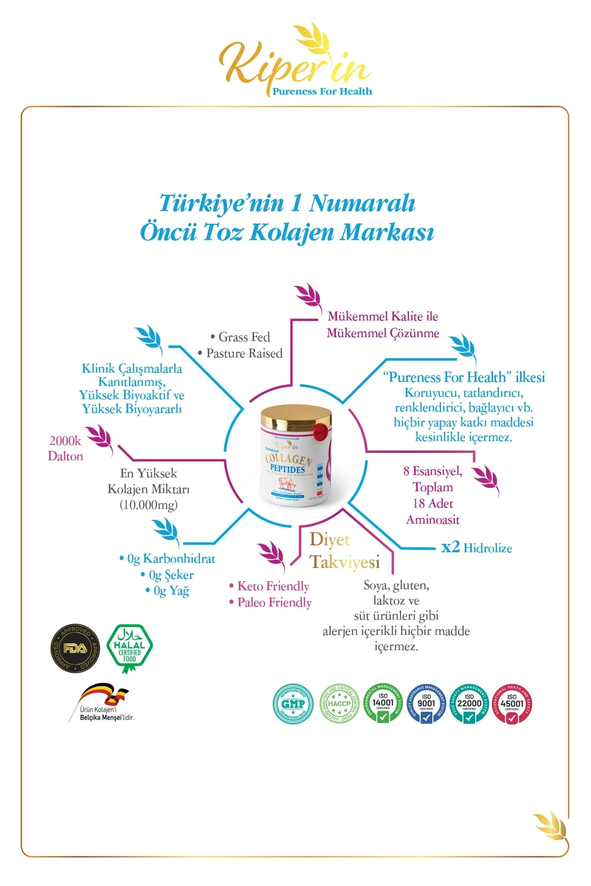 Kiperin Collagen asla katkı maddesi içermeyen, %100 saf ve doğal, yüksek biyoaktif ve yüksek biyoyararlı çift hidrolize edilmiş toz kolajen peptitleri içeren diyet takviyesidir.