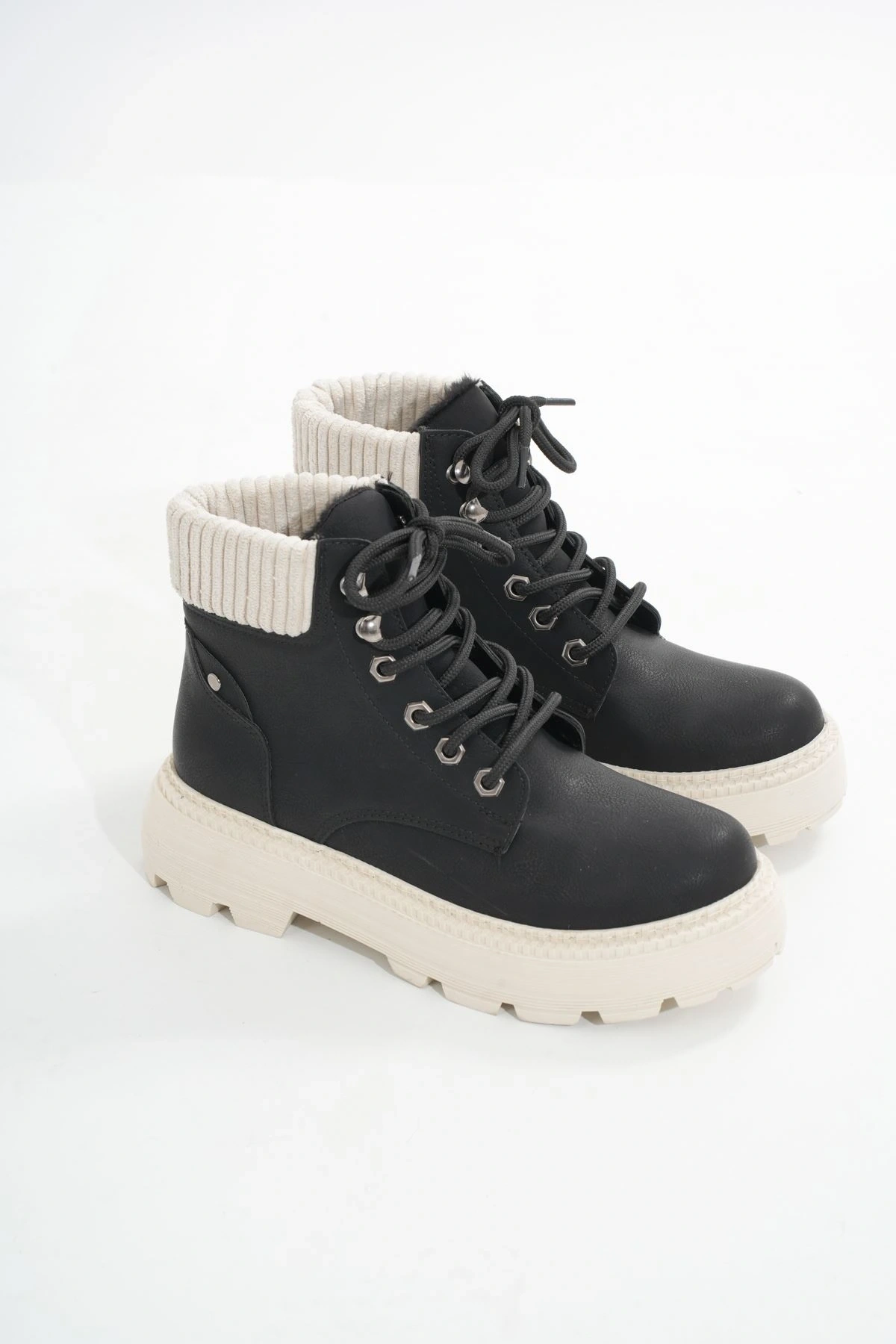 LMÇ-2045 Siyah-Bej Taban Bağcıklı Kalın Taban Kadın Günlük Bot
