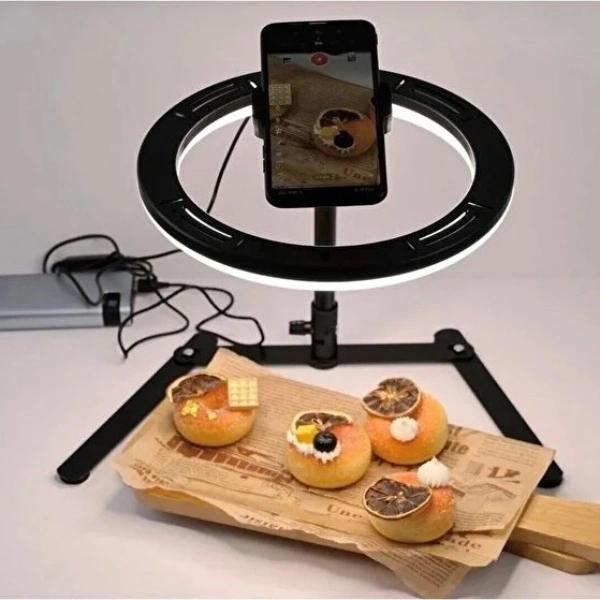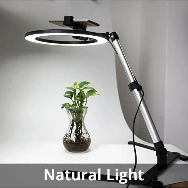 MASAÜSTÜ ÇEKİM IŞIĞIÜrün ÖzellikleriMasaüstü çekim ışığı, içerik üreticileri, online satış yapanlar ve günlük kullanımda net aydınlatma ihtiyacı duyanlar için pratik ve profesyonel bir çözüm sunar. I şeklindeki ayak tasarımı sayesinde masa üzerinde minimum alan kaplar ve dengeli bir kullanım sağlar. Yüksekliği ayarlanabilir yapısı ile 25 ila 45 cm arasında konumlandırılabilir, böylece farklı çekim açılarına ve masa düzenlerine kolayca uyum sağlar.180 derece dönebilen başlığı sayesinde ışık açısı istenilen yönde ayarlanabilir ve homojen bir aydınlatma elde edilir. Ayarlanabilir telefon klipsi, farklı telefon modelleriyle uyumlu olup 180 derece hareket kabiliyeti sunarak video, fotoğraf, canlı yayın ve görüntülü görüşmelerde ideal çekim açısını yakalamanıza yardımcı olur. Masaüstü kullanım için tasarlanan bu çekim ışığı, ürün çekimleri, sosyal medya içerikleri, makyaj videoları ve online toplantılar için net, gölgesiz ve dengeli bir ışık sağlar. Dayanıklı gövdesi ve kolay kurulum özelliği sayesinde hem evde hem ofiste uzun süreli kullanım için uygundur.Paket İçeriği1 adet Masaüstü Çekim Işığı