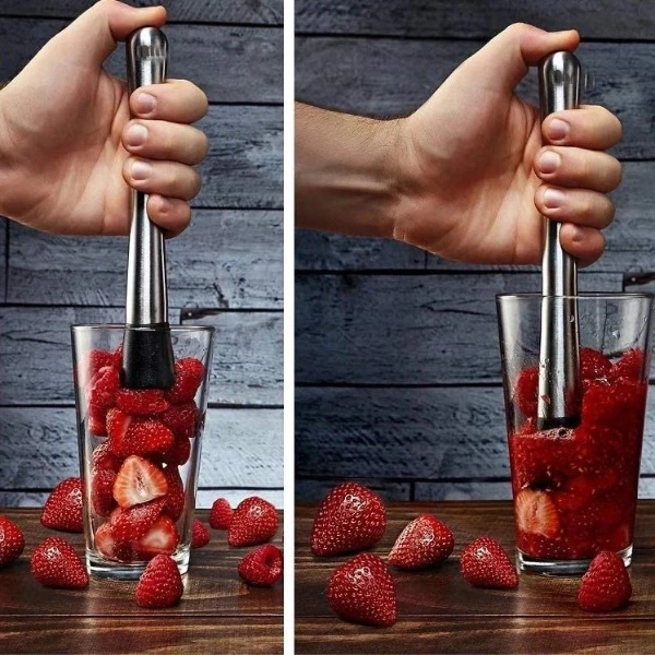 MEYVE EZİCİ TOKMAK Ürün ÖzellikleriMeyve, bitki ve buz gibi malzemeleri kolayca ezebilmeniz için tasarlanmış Paslanmaz Çelik Meyve Ezici Tokmak, hem ev kullanımı hem de profesyonel barlar için ideal bir araçtır. Sağlam ve dayanıklı paslanmaz çelik gövdesi uzun yıllar formunu korurken, alt kısmındaki özel tasarım oluklu yüzey meyveleri daha hızlı ve eşit biçimde ezmenizi sağlar. Mojito, kokteyl, limonata, detoks içeceği veya soğuk çay hazırlarken en iyi aromayı elde etmenize yardımcı olur. Kaymaz yapısı sayesinde elden kaymaz, güvenli ve rahat bir kullanım sunar. Temizlemesi son derece kolay olan bu tokmak, mutfakta pratikliğe önem veren herkes için vazgeçilmez bir yardımcıdır.Paket İçeriği1 adet Meyve Ezici Tokmak