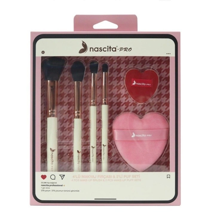 Nascita 4’lü Makyaj Fırçası & 2’li Puf Seti, günlük makyaj rutinini kolaylaştırmak ve profesyonel sonuçlar elde etmek için tasarlanmış eksiksiz bir settir. Dört farklı fırça ve iki makyaj pufu ile fondöten, allık, kapatıcı ve toz ürünleri zahmetsizce uygulamanıza yardımcı olur. Hafif ve kompakt tasarımı sayesinde evde veya seyahatte rahatlıkla kullanılabilir.