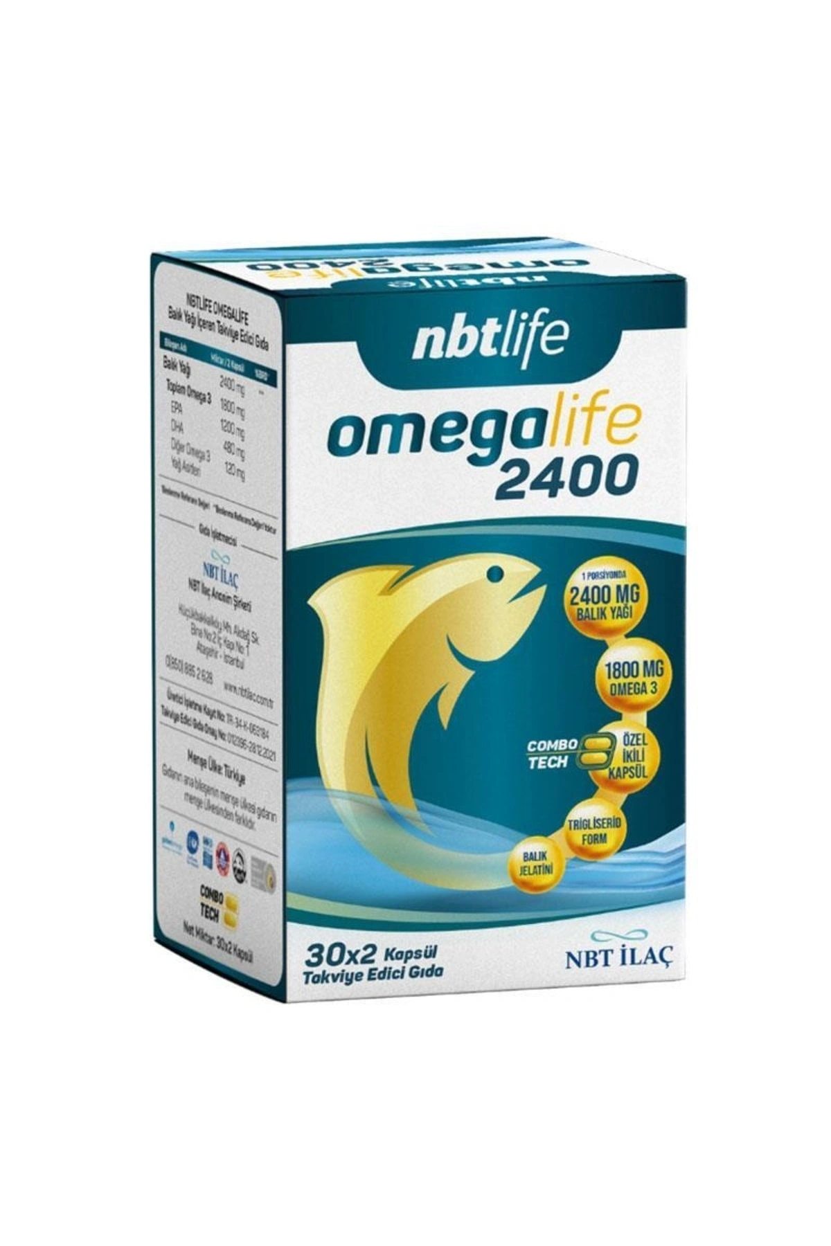 nbtlife omegalife 2400, COMBOTECH patentli, bir yuvada 2 kapsül barındıran özel blister teknolojisi ile bir porsiyonda 2400 mg balık yağından gelen, 1800 mg omega 3 içermektedir. Yüksek EPA ve DHA içeriğine sahip, küçük balıkların gövdesinden elde edilen, trigliserid formda balık yağı içermektedir.
