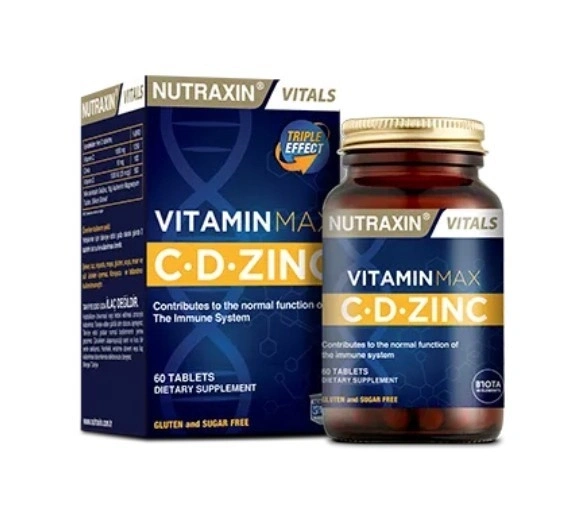 Nutraxin Vitamin Max; içeriğinde bulunan Vitamin C, Vitamin D ve Çinko ile üç güçlü bileşeni bir arada sunmaktadır. 1000 mg C vitamini,1000 IU D Vitamini ve 10 mg çinko içermektedir.
