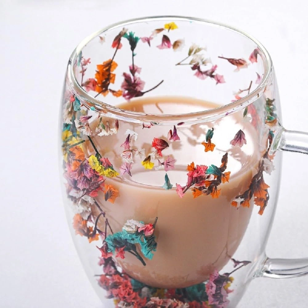 ORJİNAL KURUTULMUŞ ÇİÇEKLİ KUPA BARDAKÇift camlı kupa bardak, şık ve dayanıklı bir tasarıma sahiptir. İçerisinde özenle yerleştirilmiş kurutulmuş orijinal çiçekler, bardağa görsel bir estetik katmaktadır. Çift camlı yapısı içeceğin sıcak veya soğuk olmasına bağlı olarak izolasyon sağlar, böylece içeceklerin sıcaklığını daha uzun süre korur. Bu zarif kupa bardak, hem görsel açıdan çekici hem de içecek keyfini artıran özel bir deneyim sunar. 250 ml. kapasitesi vardır.Paket İçeriği Orjinal kurutulmuş çiçekli kupa bardak