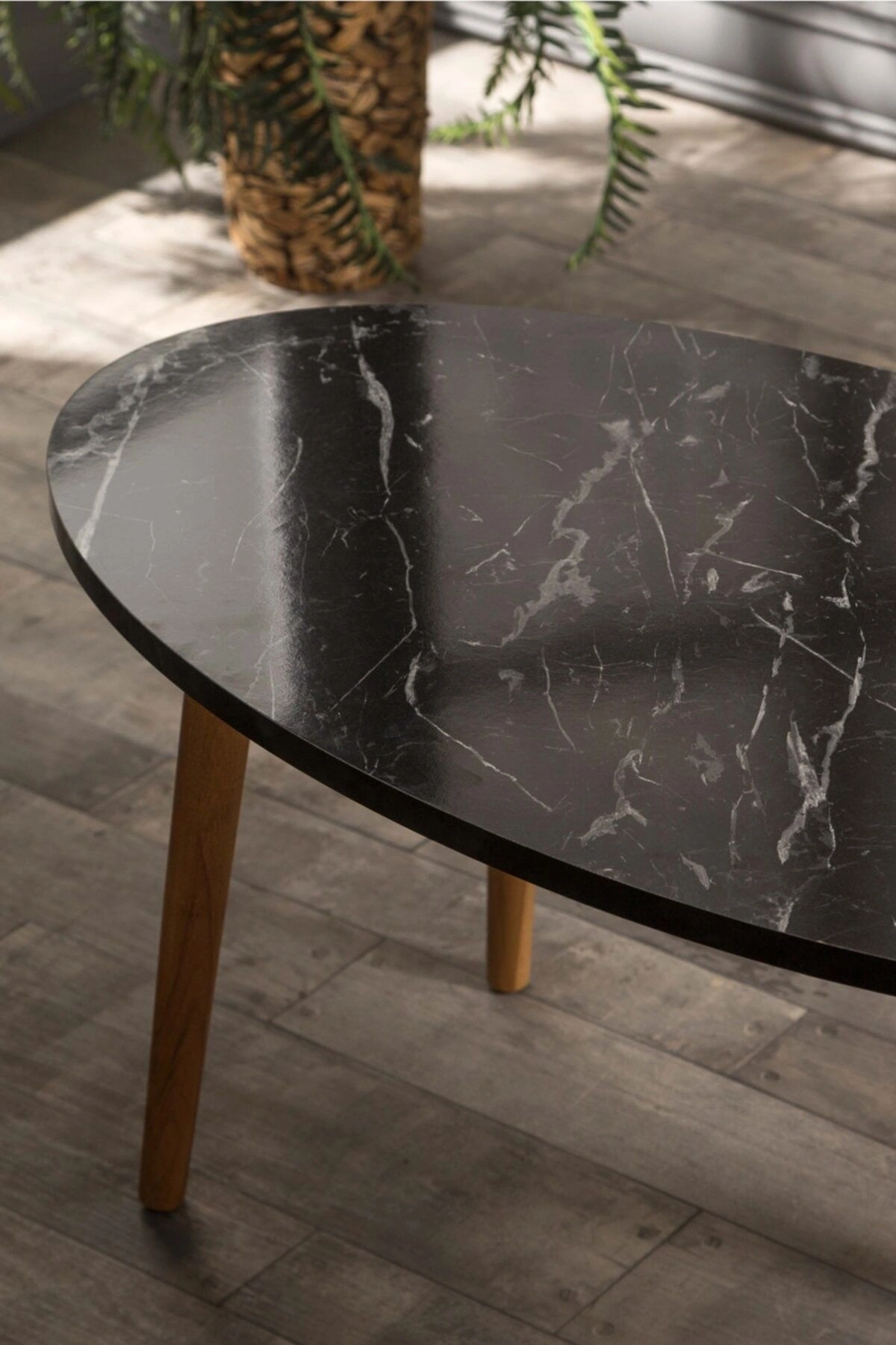 Orta Sehpa Ahşap Torna Elips Siyah Mermer Desen