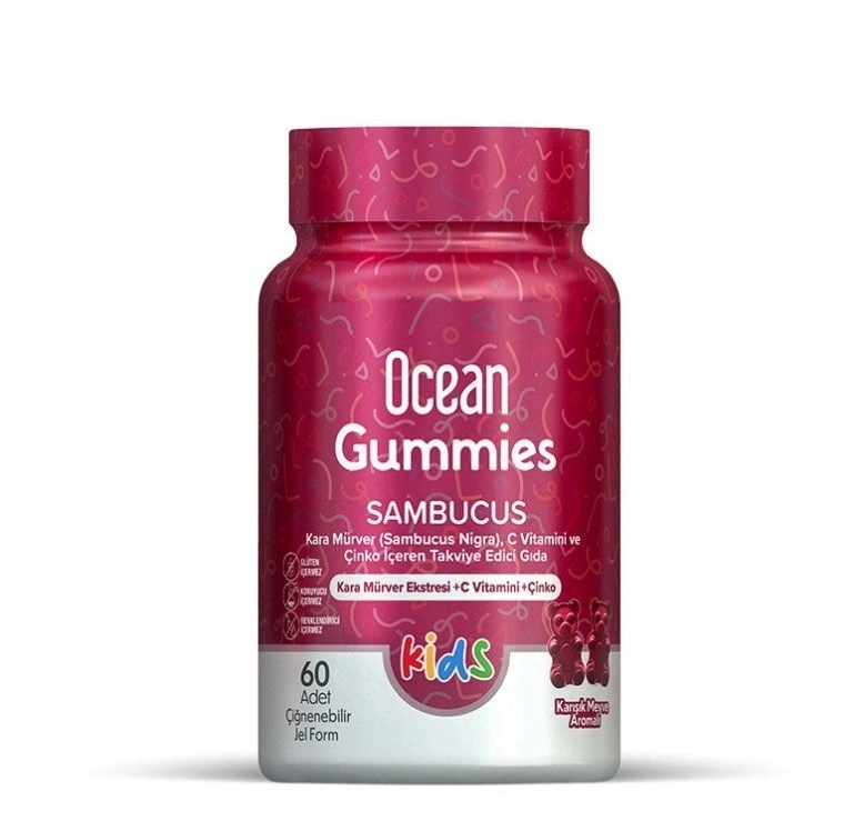 Ocean Gummies Sambucus Kids kara mürver ekstresi, C vitamini ve çinko içeren çiğnenebilir jel formda bir gıda takviyesidir.