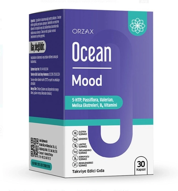 Ocean Mood 5-HTP, Passiflora, Valerian, Melisa ekstreleri ve B6 Vitamini içeren, kapsül formda bir gıda takviyesidir.