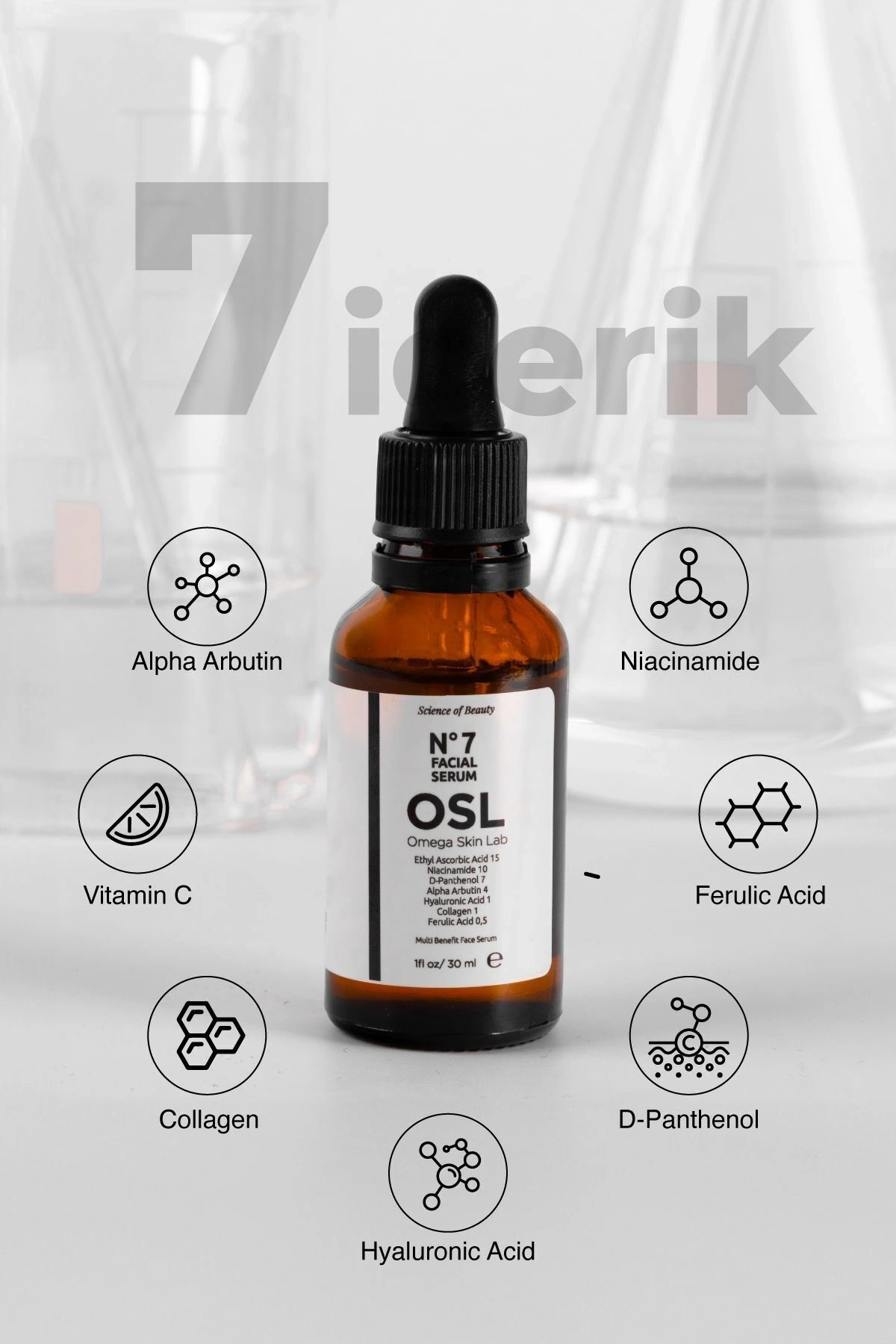 N°7 cilt serumu birçok cilt problemine karşı aynı anda hedef alan iceriklerin sinerjik kombinasyonundan oluşmaktadır. İnce çizgilerin görünümünü, cilt lekelerini azaltma ve gözenekleri küçültme, renk tonu eşitleme, cilt aydınlatma, kolajen sentezini uyarma, cildi tamir edip nemlendirmeye yardımcı bir serumdur. Antioxidan özelliği ile daha genç ve sağlıklı görünen bir cildi destekler.