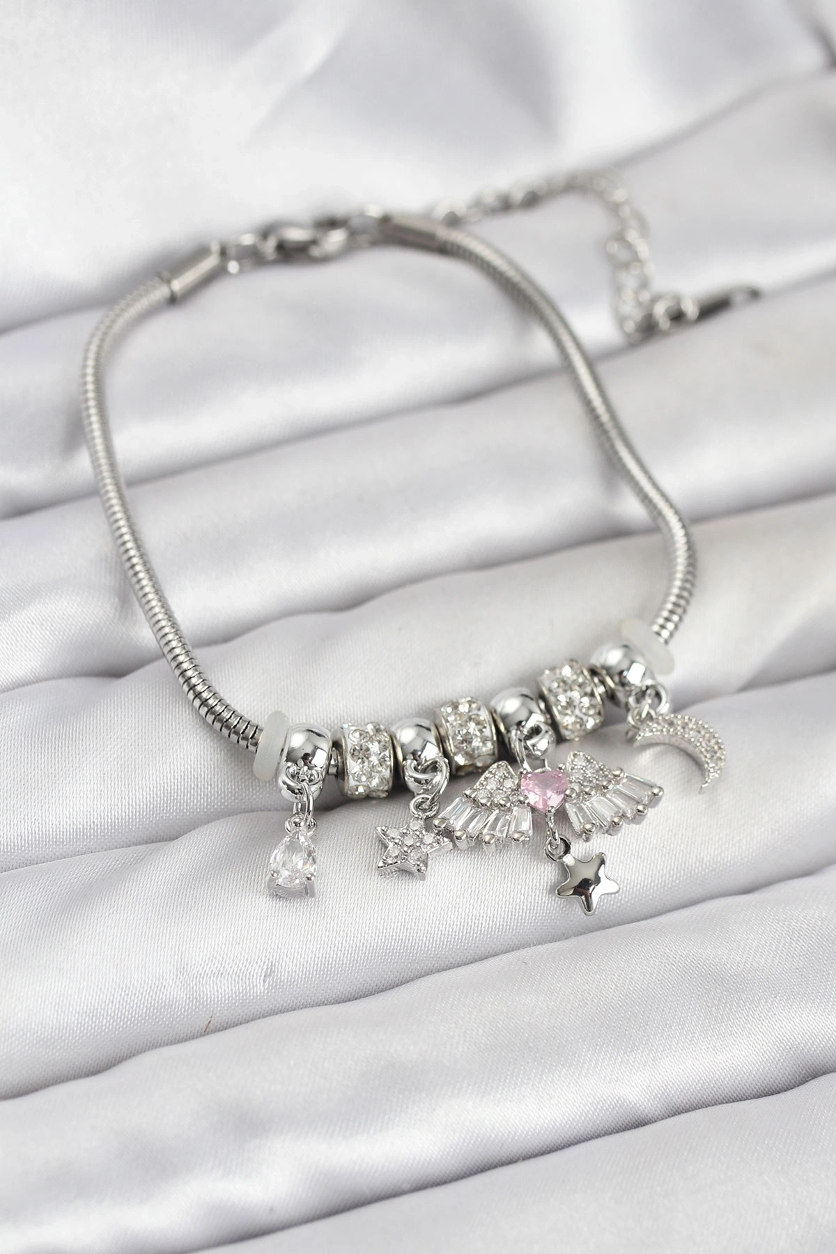 Pirinç Gümüş Renk Kanatlı Charmlı Kadın Bileklik