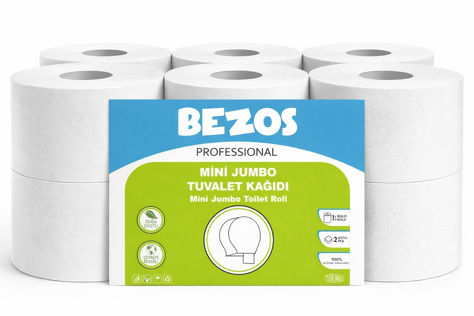 Bezos Professional Mini Jumbo Tuvalet Kağıdı 48 Rulo | 2 Katlı | %100 Selüloz | Endüstriyel & Ev Tipi Kullanım 4X12RULO Bezos Professional Mini Jumbo Tuvalet Kağıdı, yüksek tüketim alanları için özel olarak üretilmiş ekonomik, dayanıklı ve hijyenik bir çözümdür. Mini jumbo formu sayesinde daha uzun kullanım süresi, daha az rulo değişimi ve maksimum verim sağlar. ?%100 selüloz yapısı ile cilde dost ?2 katlı güçlü doku, dağılma yapmaz ? 4x 12 rulo avantajlı koli içeriği ? Mini jumbo dispenserler ile tam uyumlu ? Ofis, kafe, restoran, okul, AVM ve ev kullanımı için ideal Doğa dostu üretim anlayışı sayesinde hem çevreyi korur hem bütçenizi yormaz. Toplu kullanım alanlarında kesintisiz hijyen arayanlar için net tercih. ??Az rulo değiştir, daha çok tasarruf et.