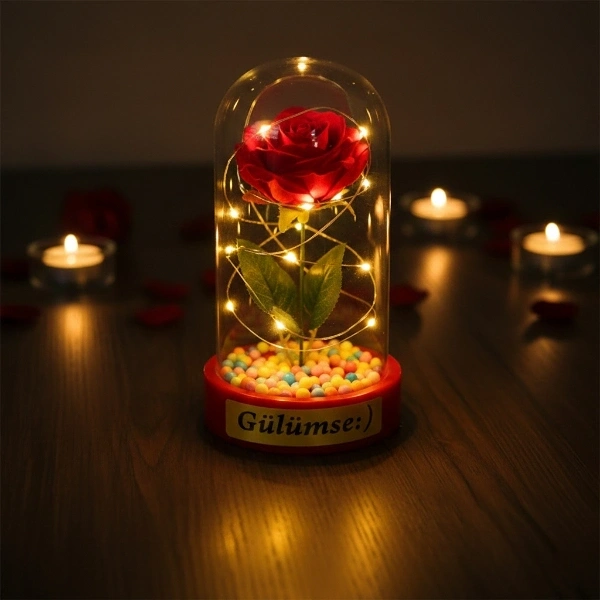 RENKLİ TOPLU LEDLİ GÜL FANUSÜrün ÖzellikleriRenkli toplu ledli gül fanus, canlı detayları ve sıcak ışık etkisiyle dekorasyona enerjik ve romantik bir hava katan şık bir üründür. Şeffaf fanus içerisinde yer alan tekli yapay gül, taban kısmındaki renkli toplar ile birlikte görsel olarak dikkat çekici bir bütünlük sunar. Sahip olduğu gün ışığı LED aydınlatma sayesinde yumuşak ve huzur verici bir ışık yayarak masa, komodin ve raf üzerinde estetik bir ambiyans oluşturur. Kompakt ölçüsüyle yer kaplamadan kullanılabilen bu model, özellikle özel günlerde dekoratif gül fanus arayanlar için ideal bir tercihtir. Model seçimi yapılamayan ürün, görsellerde yer alan tasarımlardan biri olacak şekilde karışık model gönderimi yapılmaktadır.Ürün Teknik Özellikleri Özellik Açıklama Ürün Adı Renkli Toplu Ledli Gül Fanus Boyut 10 x 18 cm Aydınlatma Gün ışığı LED Tasarım Şeffaf fanus, tekli gül Detay Taban kısmında renkli toplar Model Karışık gönderilir Kullanım Alanı Masa, komodin, raf Kullanım Amacı Dekoratif ve hediyelik Paket İçeriği1 adet renkli toplu ledli gül fanus