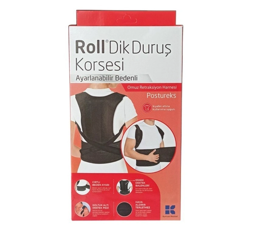 Roll Dik Duruş Korsesi, sırt kası zayıflığı ve duruş bozukluğu durumlarında dik durmayı destekleyecek ve uyarıcı etki yapacak şekilde dizayn edilmiştir. Doktor tavsiyesi ile kullanılması uygundur. Sırt kısmına yerleştirilmiş esneyebilen balenler ile ekstra destek sağlar. Ayarlanabilir cirtli bant sistemi ile farklı bedenler için tek ürün kullanılabilir. Esnek bantlara takılabilen ekstra destek pedleri, koltuk altında konforlu kullanım sağlar. Gözenekli esnek kumaş yapısı sayesinde hava aldırır. Kıyafet altında kullanıma uygundur. Soğuk veya ilik suda yıpratmadan elde yıkanabilir ve düz bir zeminde kurutulabilir. Esnekliğini kaybetmemesi için sıcak su ile temas ettirilmemelidir. Doktorunuza danışınız. Serin, rutubetsiz ve tozsuz yerde saklayınız.