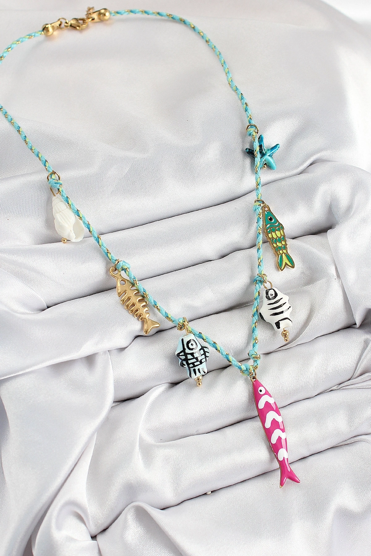 Seramik Motifli Pembe Balık Figürlü Model Mavi İp Kadın Kolye