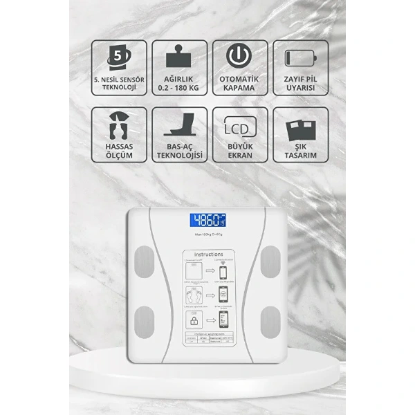 BEYAZ RENK BLUETOOTH ÖZELLİKLİ AKILLI TARTIÜrün ÖzellikleriModern yaşamın vazgeçilmez sağlık yardımcısı olan Beyaz Renk Bluetooth Özellikli Akıllı Tartı, yalnızca kilonuzu değil, aynı zamanda vücut kompozisyonunuzu da detaylı şekilde analiz eder. Gelişmiş sensör teknolojisiyle donatılan bu akıllı tartı, vücut yağı, su oranı, kas kütlesi, kemik kütlesi, protein oranı, visseral yağ, BMI (Vücut Kitle İndeksi) ve BMR (Bazal Metabolizma Hızı) gibi verileri yüksek hassasiyetle ölçer.Bluetooth bağlantısı sayesinde akıllı telefon uygulamasıyla kolayca eşleşir ve ölçüm sonuçlarını anlık olarak kaydeder. Böylece zaman içerisindeki vücut değişimlerinizi takip etmenize imkân tanır. LCD ekranı, ölçüm sonuçlarını net bir şekilde gösterirken, otomatik kapanma özelliği pil ömrünü uzatır ve enerji tasarrufu sağlar. Maksimum 180 kg kapasiteye sahip dayanıklı yapısı, uzun ömürlü kullanım sunar.Şık, sade ve modern tasarımı ile her banyo, spor salonu ya da sağlık merkezine estetik bir dokunuş katar. Hem günlük kullanım hem de profesyonel fitness takibi için mükemmel bir yardımcıdır.Paket İçeriği1 adet Beyaz Renk Bluetooth Özellikli Akıllı Tartı
