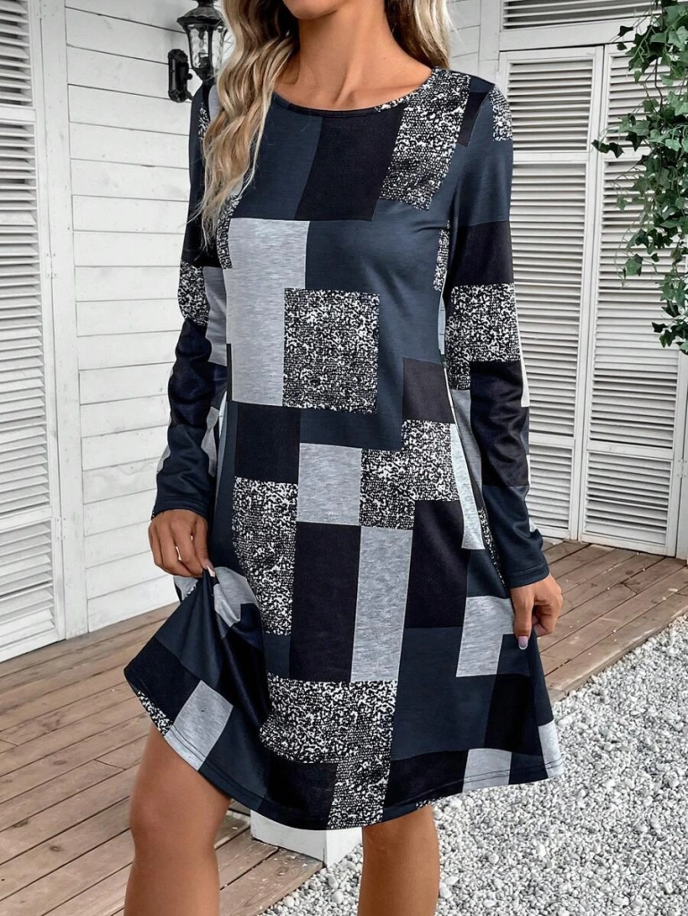 Kadın Uzun Kollu Yuvarlak Yaka Geometrik Süprem Elbise