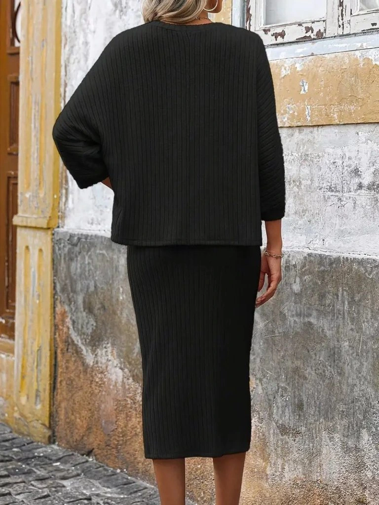 Kadın Uzun Kollu Yuvarlak Yakalı şardonlu Kaşkorse Bluz Ve Etek Ikili Takım