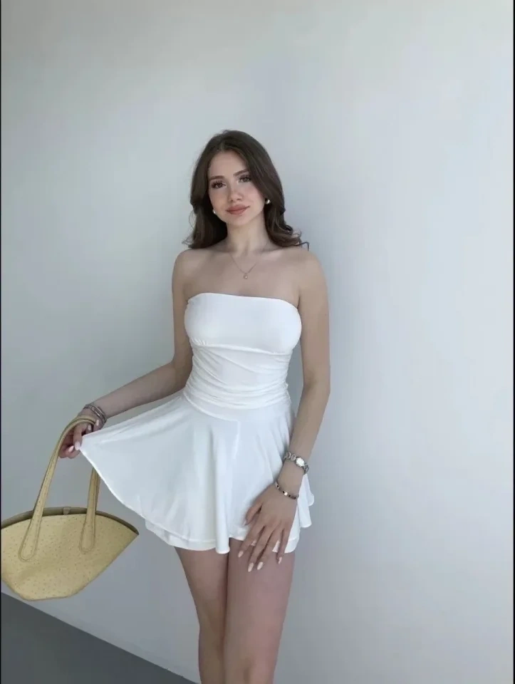 Straplez Mini Etek Görünümlü Şortlu Elbise Büzgülü Şık Yazlık - Beyaz