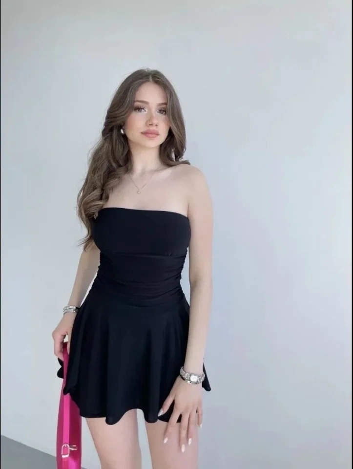 Straplez Mini Etek Görünümlü Şortlu Elbise Büzgülü Şık Yazlık - Siyah