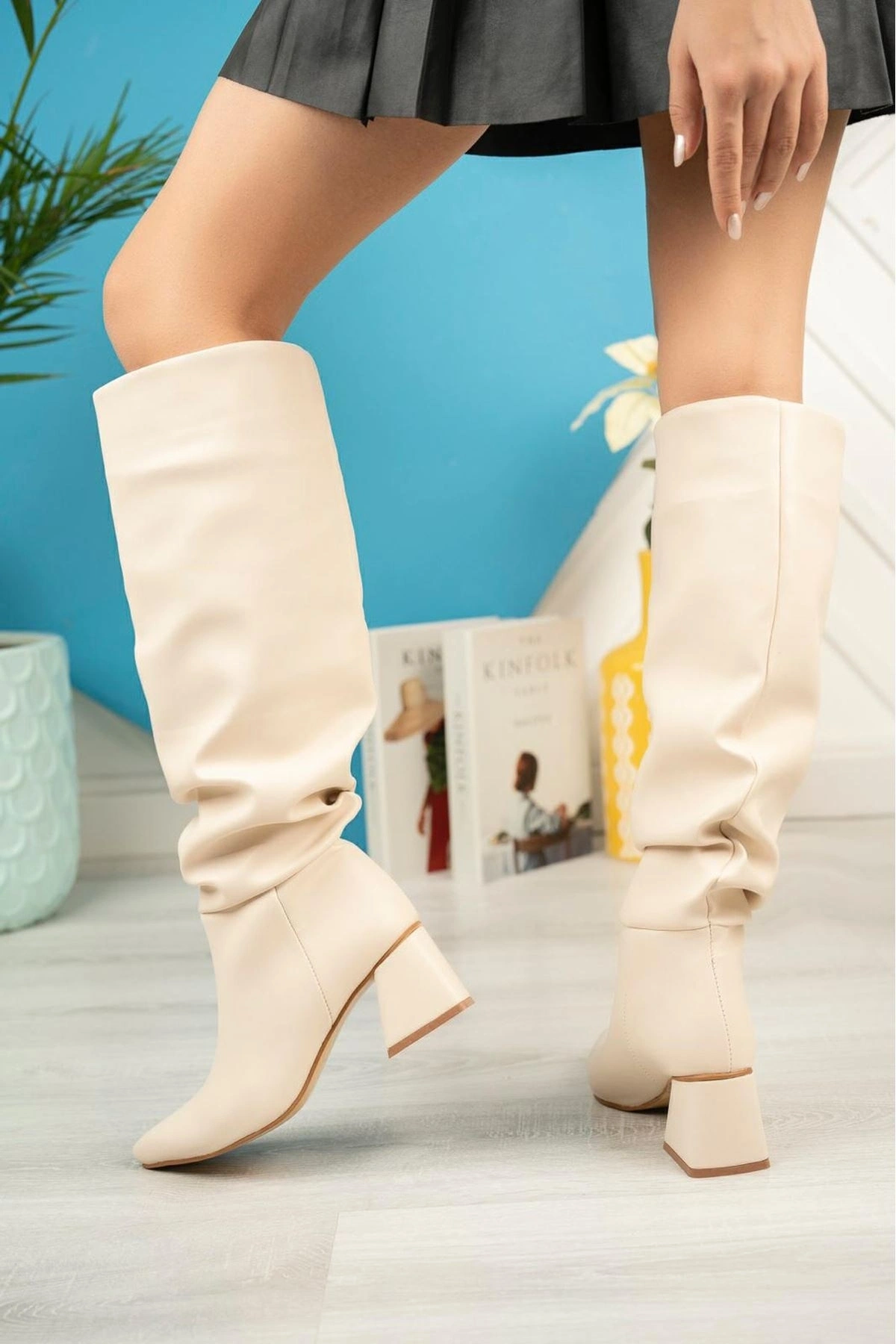 SYT-2002 Bej Körüklü Kalın Topuklu Günlük Bayan Çizme