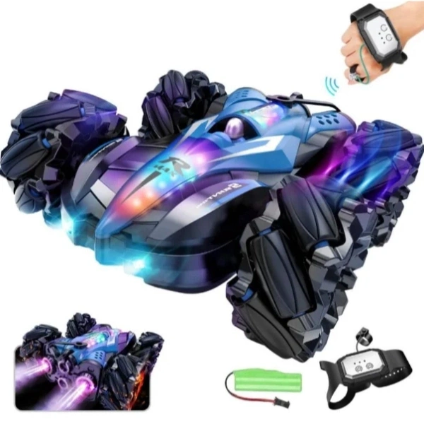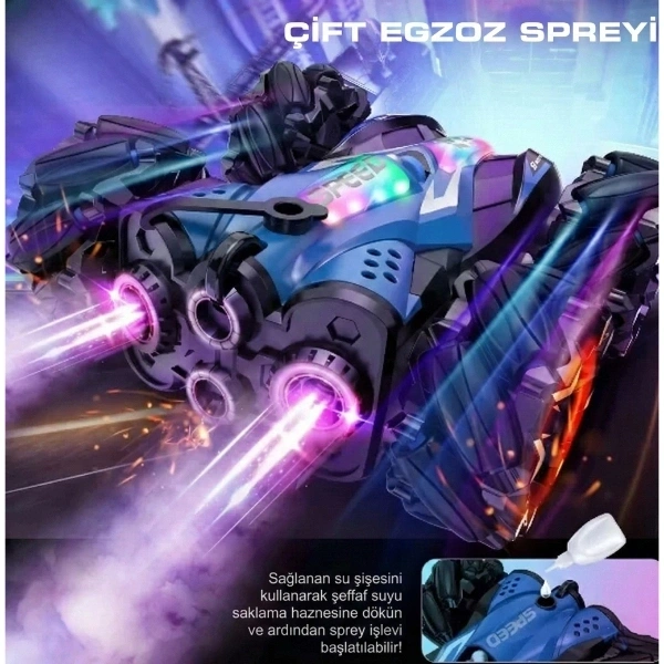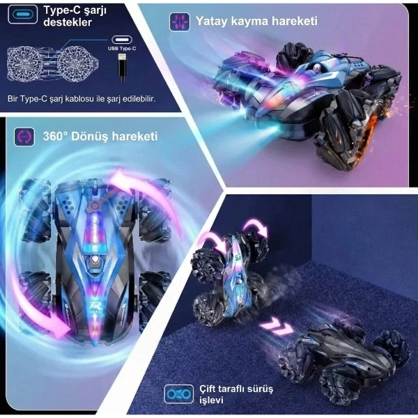 UZAKTAN KUMANDALI AKROBAT ARABAÜrün ÖzellikleriUzaktan Kumandalı Akrobat Araba, hem klasik kumanda hem de bileğe takılan hareket algılayıcı kontrol sistemi sayesinde çocuklara ve yetişkinlere eğlence dolu bir sürüş deneyimi sunar. Bilekten kontrol özelliği sayesinde el hareketleriyle yönlendirme yapılabilir ve bu da oyunu çok daha gerçekçi ve interaktif hale getirir. Güçlü motor yapısı ile zorlu zeminlerde dahi yüksek performans göstererek ileri, geri, sağ, sol hareketlerin yanı sıra takla atma ve dönüş gibi akrobatik hareketleri kolaylıkla gerçekleştirir.Duman efekti ve renkli LED ışık sistemi ile donatılan bu uzaktan kumandalı araba, özellikle karanlık ortamlarda görsel olarak dikkat çekici bir oyun deneyimi sunar. Şarjlı batarya yapısı sayesinde pil masrafını ortadan kaldırır ve ürünle birlikte gelen yedek batarya sayesinde oyun süresi kesintiye uğramadan devam eder. Dayanıklı dış gövdesi darbelere karşı dirençli olup, uzun süreli kullanım için uygundur. Ev içinde ve açık alanlarda rahatlıkla kullanılabilir, çocukların el-göz koordinasyonunu ve refleks gelişimini destekler.Paket İçeriği1 adet uzaktan kumandalı akrobat araba