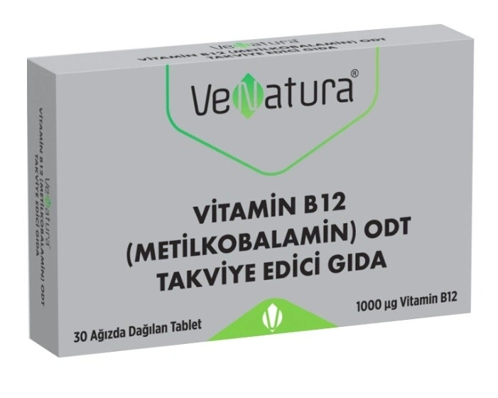 Venatura B12 Metilkobalamin,1 tablette 1000 mcg B12 metilkolabamin bulunan takviye edici bir gıdadır. İçeriğinde bulunan B12; normal enerji oluşum metabolizmasına, bağışıklık sisteminin normal fonksiyonuna, yorgunluk ve bitkinliğin azalmasına katkıda bulunmaktadır.