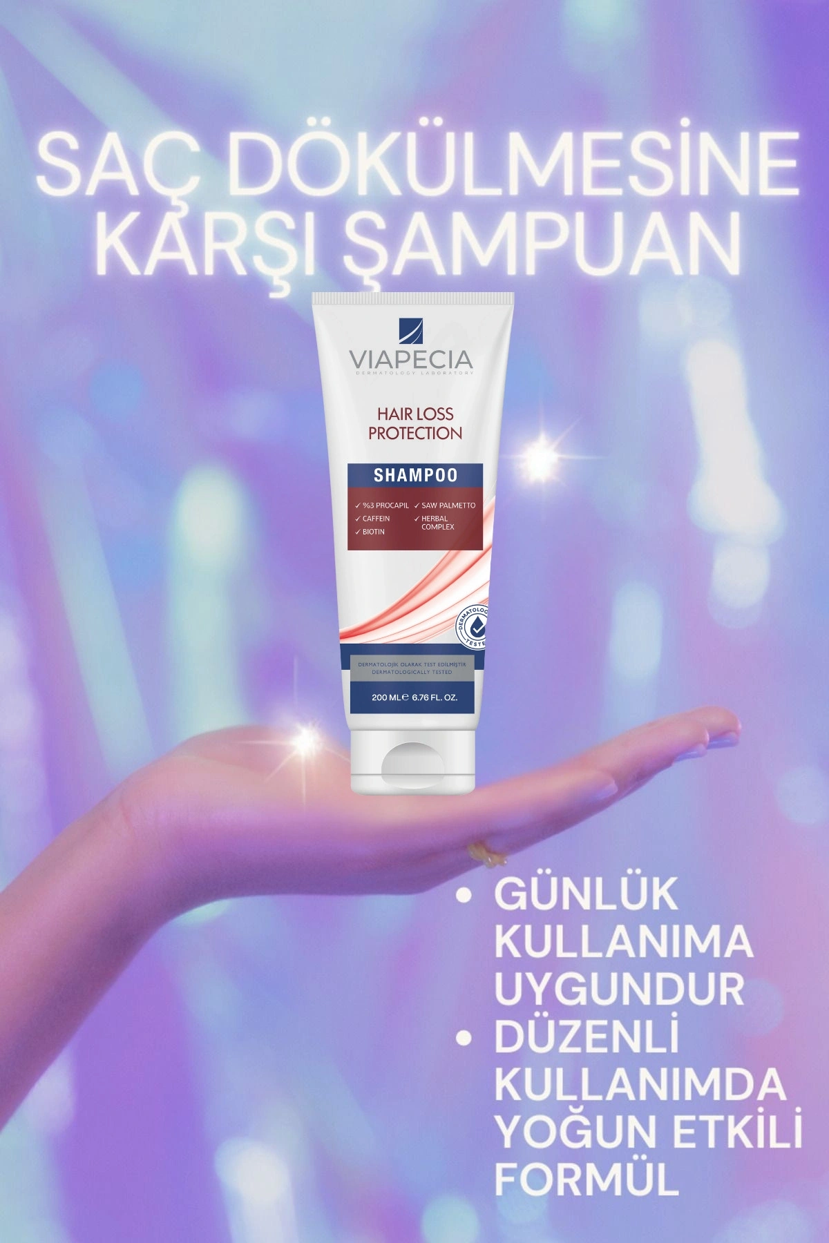 önlemeye yardımcı özel formülüyle Viapecia Şampuan, saç köklerini güçlendirerek daha sağlıklı ve dolgun saçlara kavuşmanıza destek olur. %3 Procapil, Kafein, Biotin, Saw Palmetto ve Bitkisel Kompleks içeriğiyle saç dökülmesine karşı etkili bir bakım sunar. Dermatolojik olarak test edilmiş formülü sayesinde hassas saç derisine uygun yapıdadır.