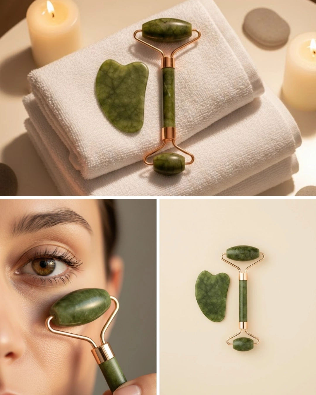 Yeşim taşı roller ve gua sha seti, doğal taşın sağladığı serinlik etkisini cilt bakım rutininize taşır. 2 parçalı set yapısı ile hem masaj hem de yüz şekillendirme uygulamalarında pratik kullanım sunar.Roller aparatının çift başlıklı yapısı farklı yüz bölgelerine uyum sağlar. Gua sha taşı ise yüz hatlarını belirginleştirmeye yardımcı olur ve masaj sırasında kan dolaşımını destekler.Düzenli kullanım, şişkinlik görünümünün azalmasına ve cildin daha canlı görünmesine katkı sağlayabilir. Özellikle sabah bakım rutininde göz altı bölgesinde ferahlatıcı etki sunar.Ergonomik tasarımı sayesinde elde rahat tutulur. Dayanıklı metal bağlantı noktaları uzun süreli kullanım için tasarlanmıştır.