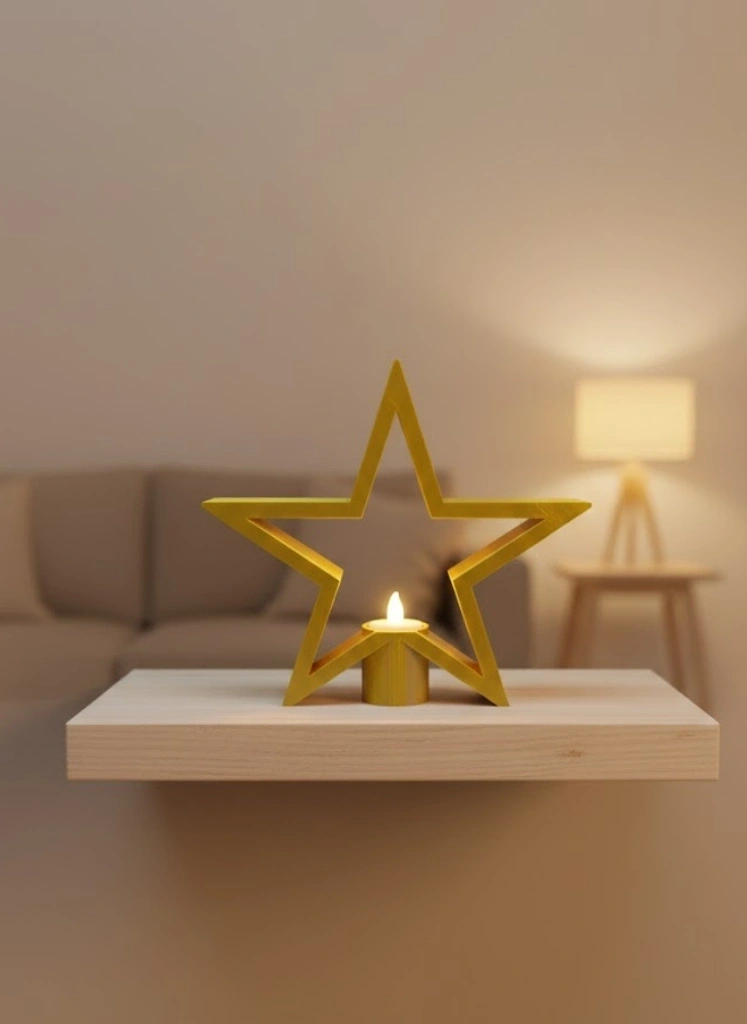 Dekoratif sarı yıldız mumluk, sıcak tonuyla yaşam alanlarına canlılık kazandırır. Raf üstü veya masa üzerinde kullanıldığında mekâna derinlik ve şıklık katar. Mum ışığıyla birlikte loş bir aydınlatma sağlayarak rahatlatıcı bir salon atmosferi oluşturur. Estetik ve işlevsel tasarımıyla ev ve ofis dekorasyonu için şık bir tamamlayıcıdır.
