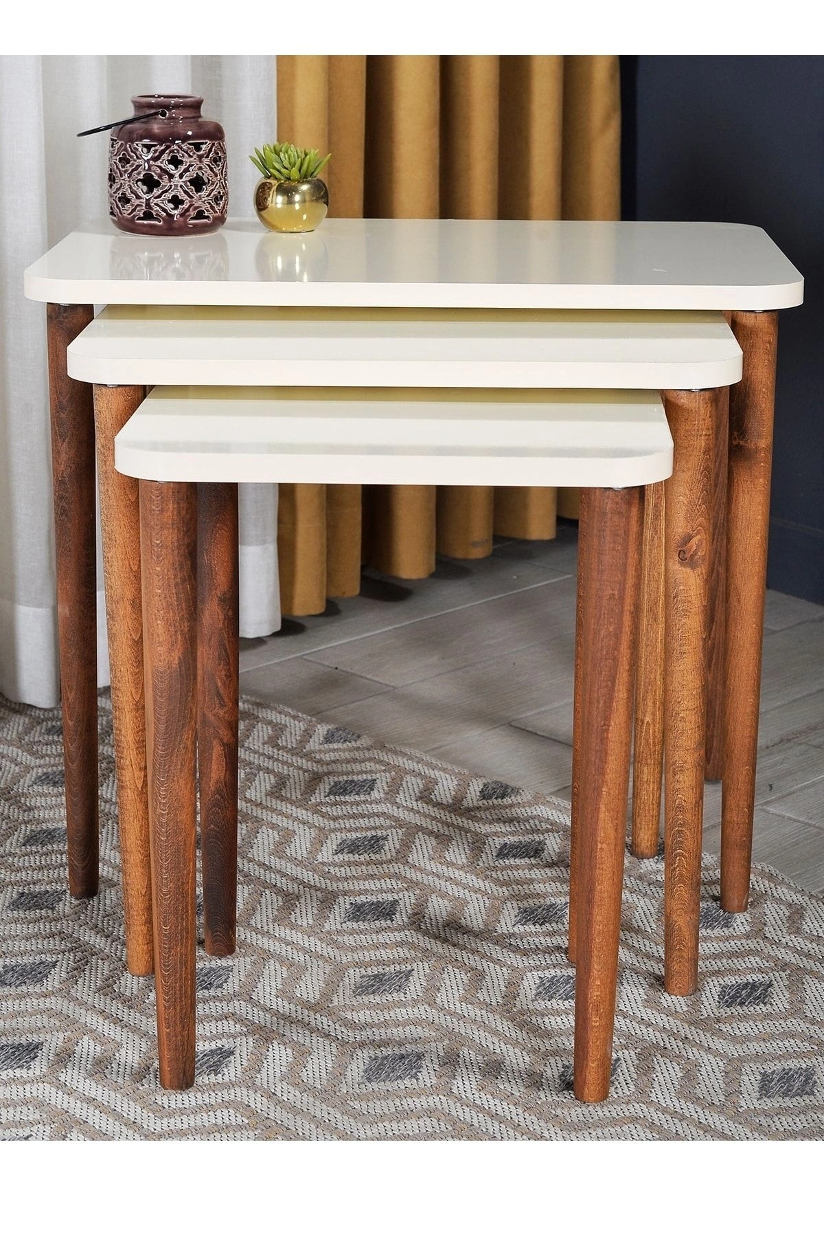 Ürün 1. ; Sınıf Kaliteli Yonga Levha Kullanılarak Üretilmiştir. ; Ayaklar Ahşap Malzemeden Üretilmiştir. ; Adınıza Faturalı, Kargo Ücretsizdir. ; Ürün Ölçüleri: En Küçük Sehpa: Yükseklik 45,5, Genişlik 36, Derinlik 28 Cm Orta Sehpa : Yükseklik 48,5, Genişlik 48,5, Derinlik 33 Cm Büyük sehpa :Yükseklik 51,5, Genişlik 60, Derinlik 37,5 Cm;