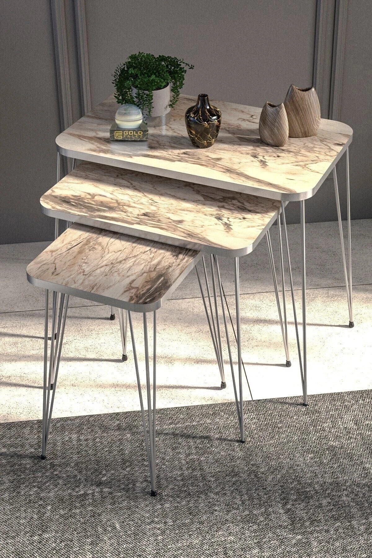 ZİGON SEHPA ÖLÇÜLER: ; ZİGON BÜYÜK YÜKSEKLİK :55 CM EN:37 BOY:60 ; ZİGON ORTA YÜKSEKLİK :51 CM EN:37 BOY:44,5 ; ZİGON KÜÇÜK YÜKSEKLİK:47 CM EN:37 BOY:28 ; Kenarları 1. sınıf ÖZEL ÜRETİM GOLD PVC bant ile kaplıdır. ; Kullanılan malzeme TSE, Avrupa Birliği EN, ISO 9001 ve FSC belgelerine sahiptir. ; Ayaklar 1.kalite Metaldir. ; Paketlerde kolay kurulum için gerekli tüm vida ve aksesuarlar bulunmaktadır. ; Ürünün montajı oldukça kolaydır.Basit el aletleri ile kolayca kurulum yapabilirsiniz. ; Hızlı ve hatasız kurulum için parça üzerinde kurulum şeması ile uyumlu parça bulunmaktadır. ; Üzerinde bulunan aksesuarlar dahil değildir. ;