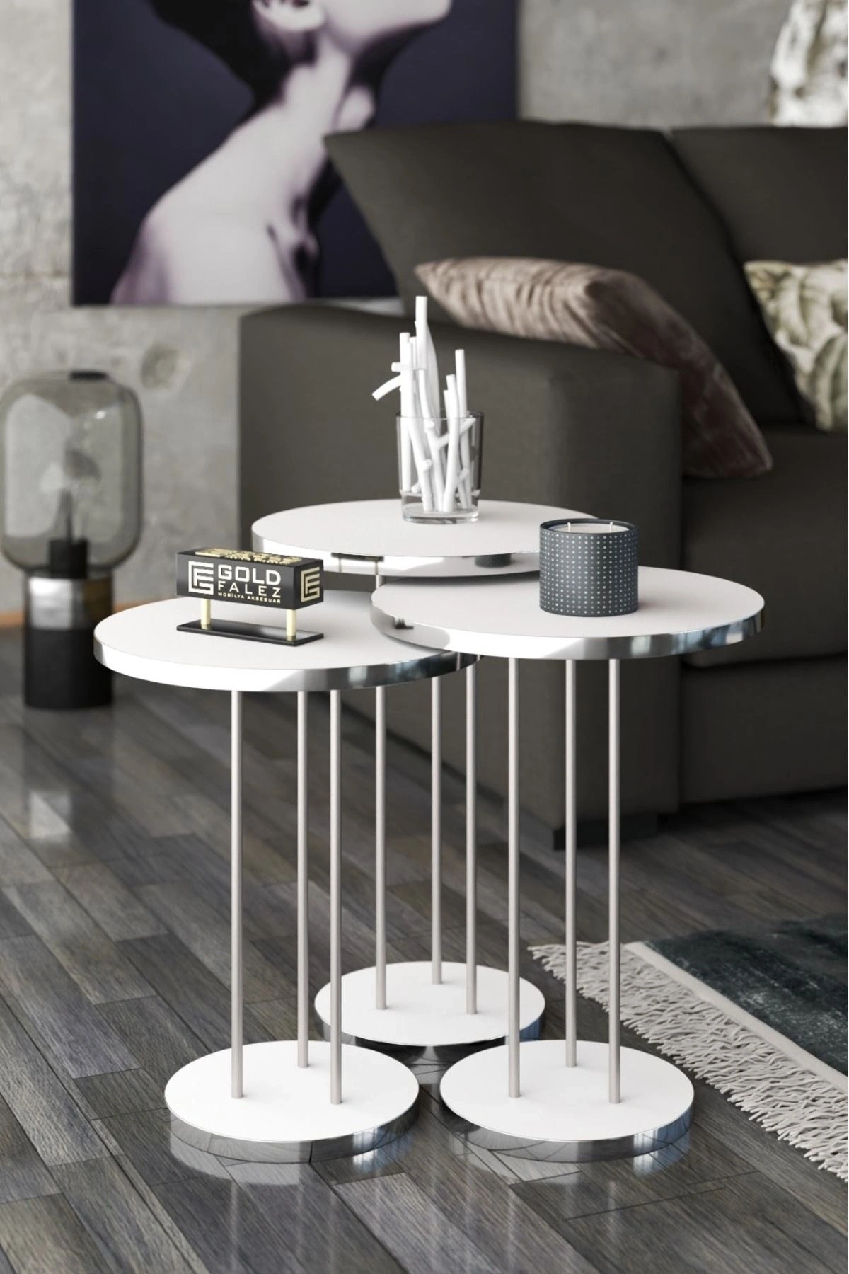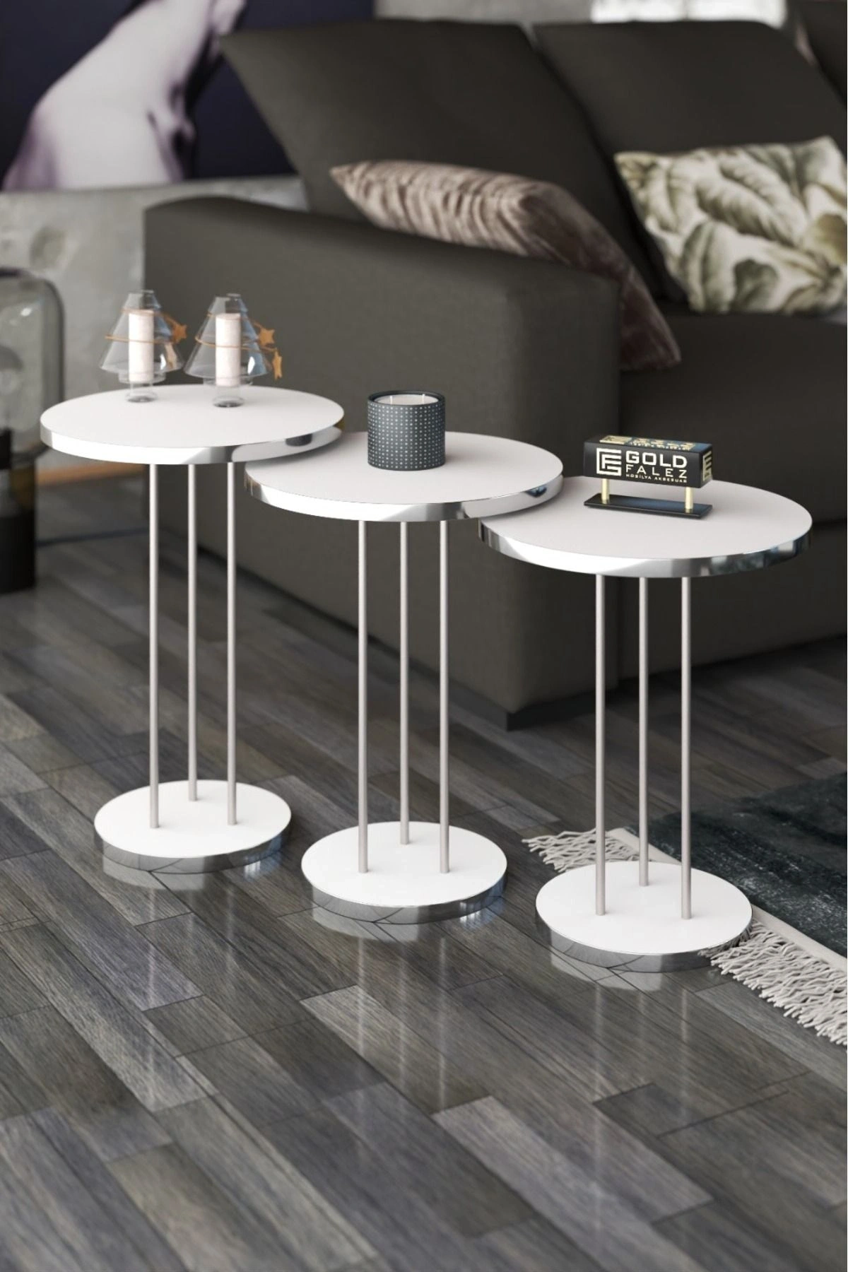 Ürün ölçüleri: ; · Tum ust tablalar 34 çaptır ; · Tum alt tablalar: 22 çaptır ; · Ayak yukseklik ; · Uzun ayak:48 cm ; · Orta boy ayak: 45 cm ; · Kucuk boy ayak:42 cm ; · Ust tabla yonga levha olup ayaklari 1.kalite metaldir. ; · Kenarları 1. sınıf PVC bant ile kaplıdır. ; · Uzun sure kullanim olmasi adina ürünün ortasinda 3 adet boru metal ayak mevcuttur. ; · Kullanılan malzeme TSE, Avrupa Birliği EN, ISO 9001 ve FSC belgelerinesahiptir. ; · Paketlerde kolay kurulum için gerekli tüm vida ve aksesuarlar bulunmaktadır. ; · Ürünün montajı oldukça kolaydır. Basit el aletleri ile kolayca kurulum yapabilirsiniz. ; · Hızlı ve hatasız kurulum için parça üzerinde kurulum şeması ile uyumluparça bulunmaktadır. ; · Üzerinde bulunan aksesuarlar dahil değildir. ;
