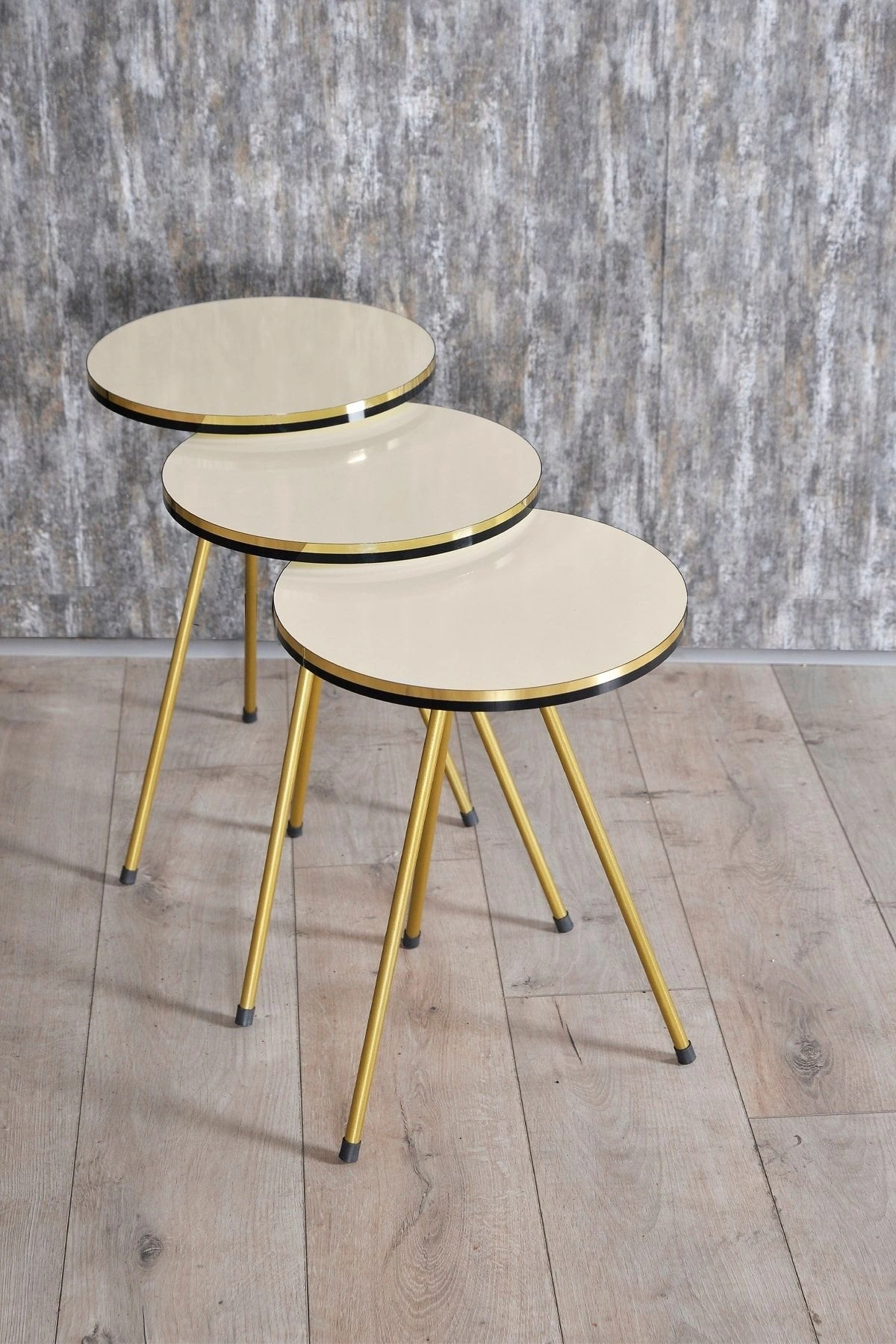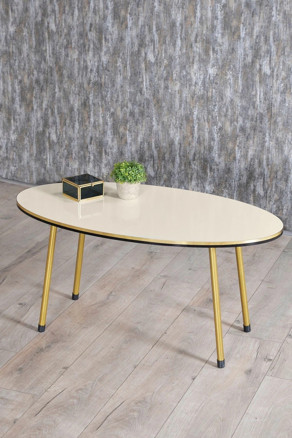 Zigon Sehpa ve Orta Sehpa Elips Krem Set Metal Ayak Çift Gold