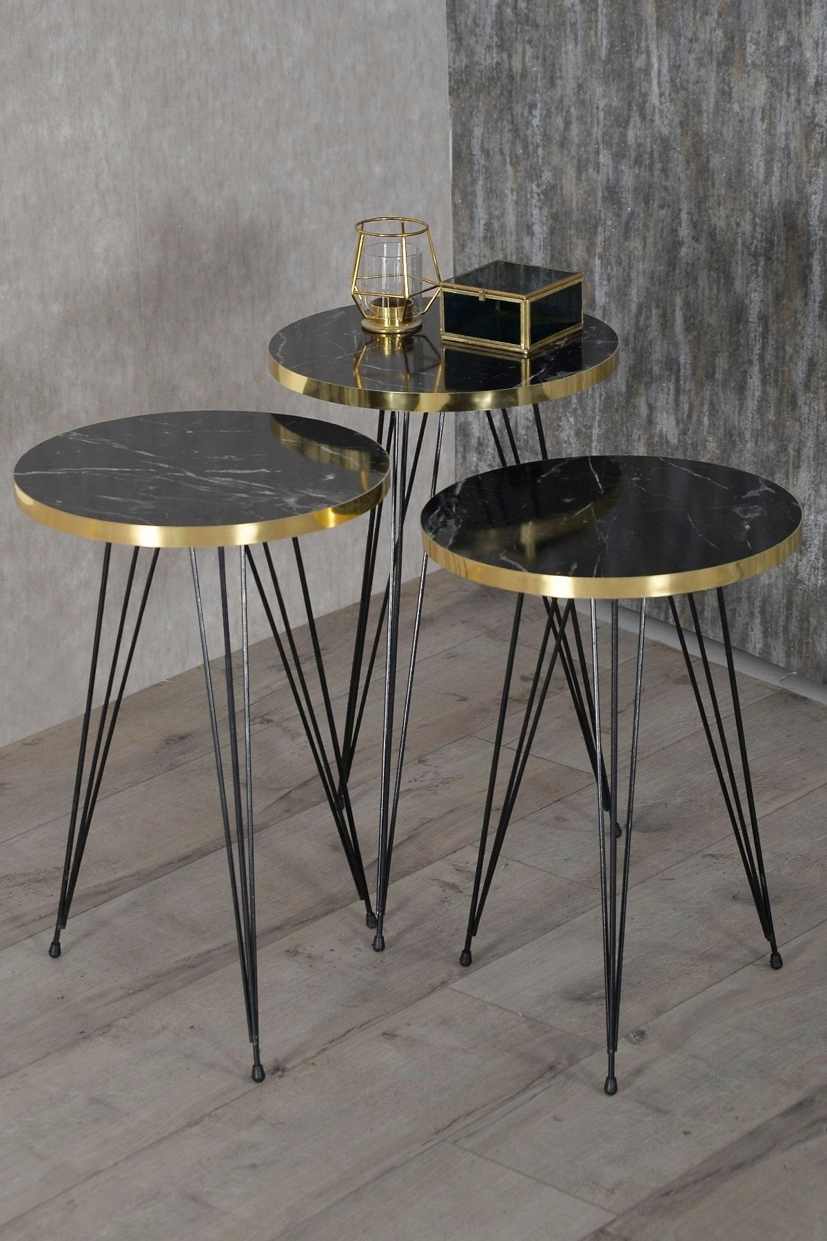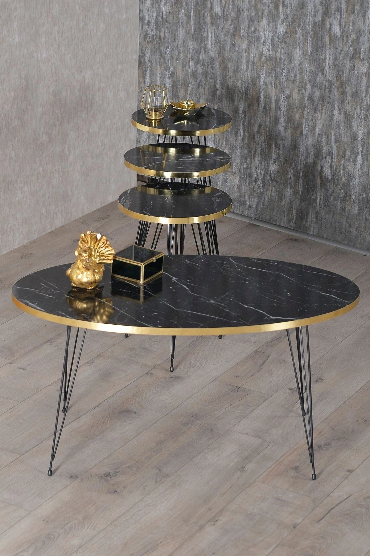 ORTA SEHPA:EN BOY:50*90 ORTA SEHPA YÜKSEKLİK:43 CM ; ZİGON SEHPA TÜM ÜST ÇAPLAR:34 CM ; ZİGON KÜÇÜK YÜKSEKLİK :47 CM ; ZİGON ORTA YÜKSEKLİK :51 CM ; ZİGON BÜYÜK YÜKSEKLİK:55 CM; ; Kenarları 1. sınıf ÖZEL ÜRETİM GOLD PVC bant ile kaplıdır.; Orta Sehpa ve 3.lü Zigon Sehpa Toplam 4 Parça Gönderim Sağlanmaktadır.. ; ?Kullanılan malzemeTSE, Avrupa Birliği EN, ISO 9001 ve FSC belgelerine sahiptir. ; Ayaklar 1.kalite Metaldir. ; Paketlerde kolay kurulum için gerekli tüm vida ve aksesuarlar bulunmaktadır. ; Ürünün montajı oldukça kolaydır.Basit el aletleri ile kolayca kurulum yapabilirsiniz. ; Hızlı ve hatasız kurulum için parça üzerinde kurulum şeması ile uyumlu parça bulunmaktadır.;
